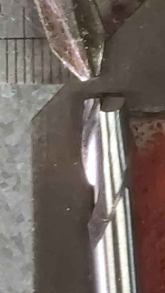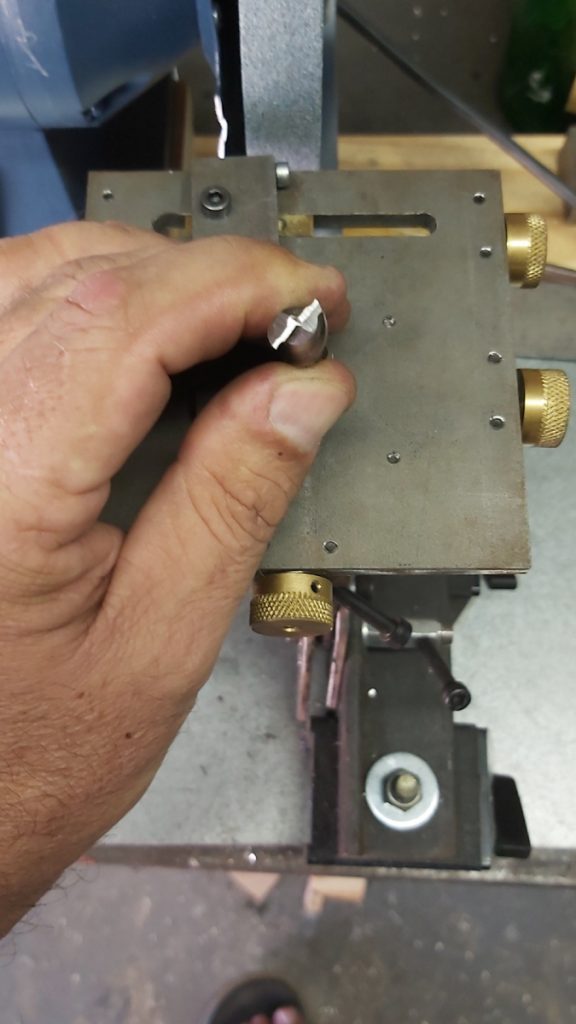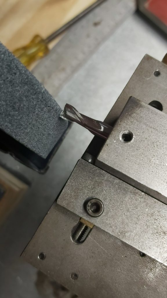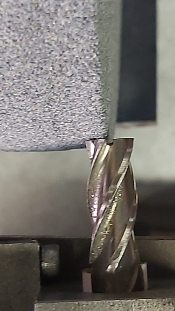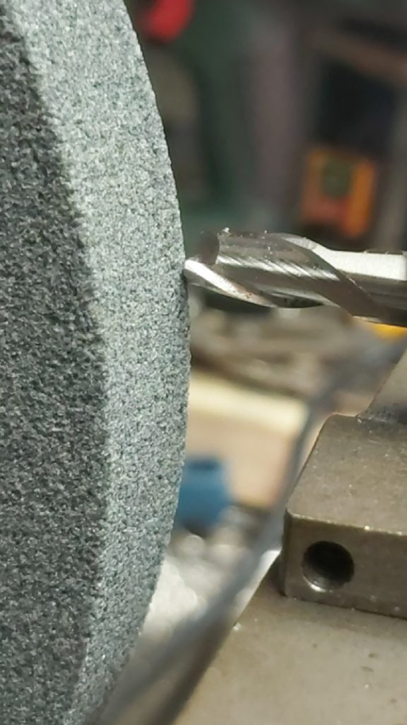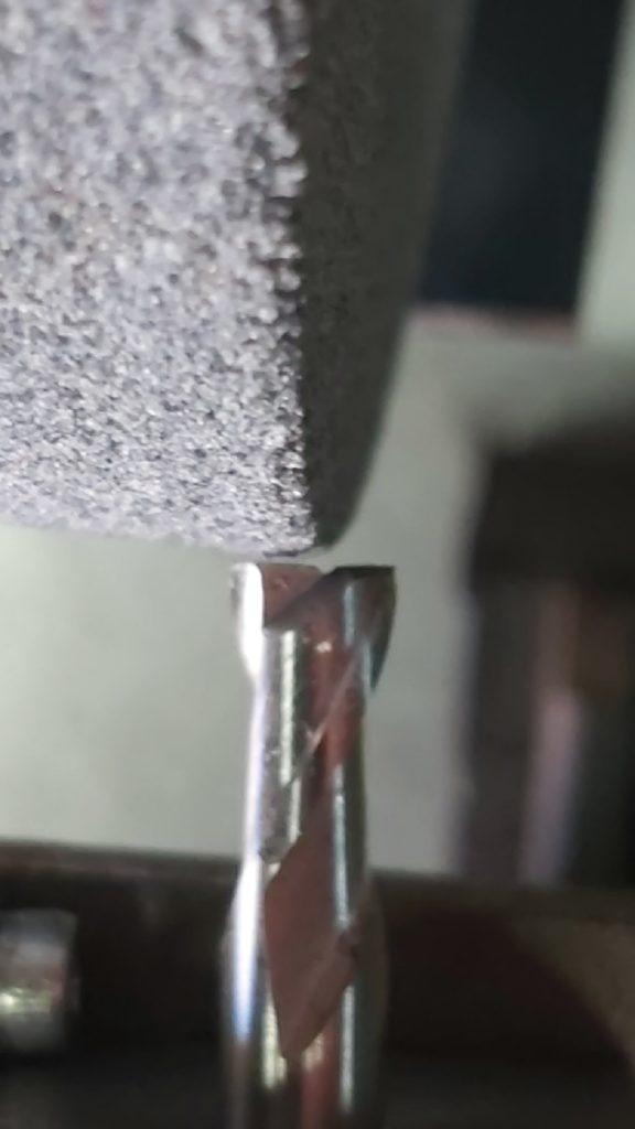It can be seen that the stone will only grind one of the two flutes. I show here that an ordinary grinding stone can be used. A Cup type or CBN wheel will be nice, but is not necessary.