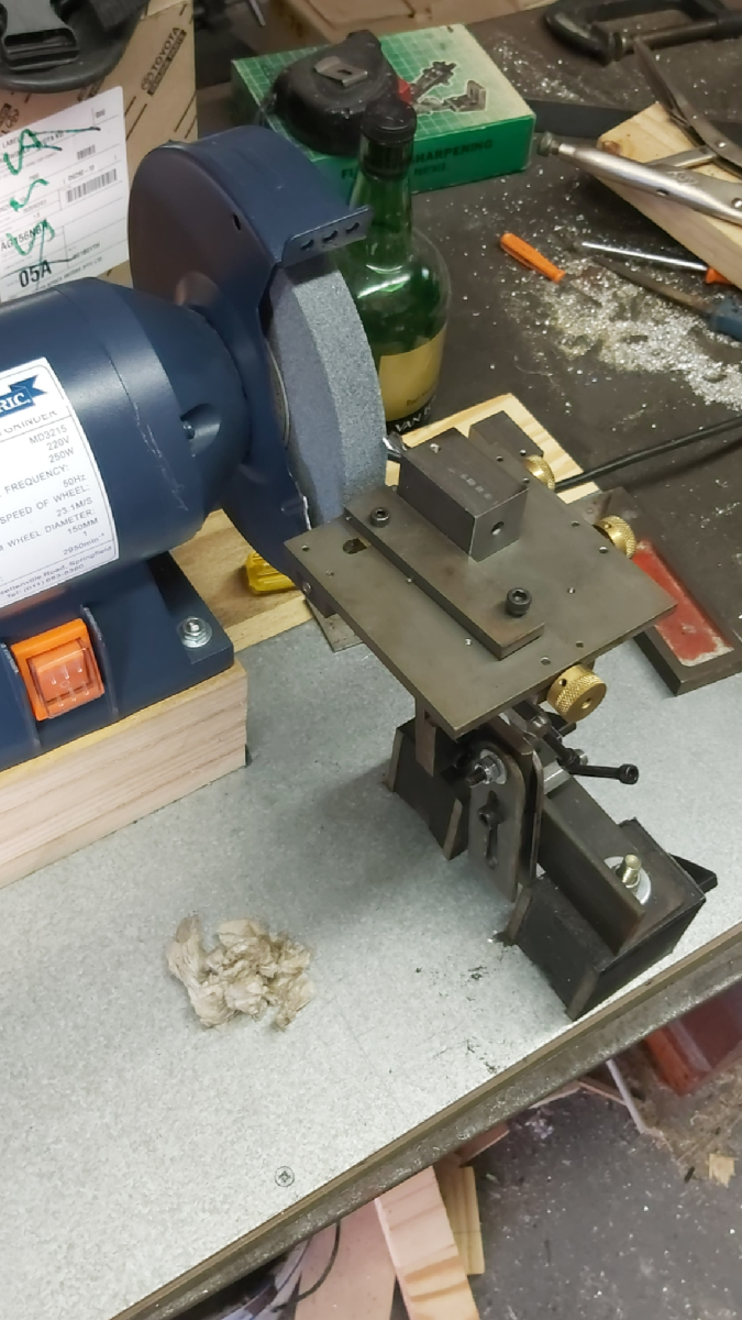 This tool rest can be made on a lathe only. No milling machine is needed, although the making will be easier if you do have a milling machine, or access to one. This tool rest allows you to be able to present your tools to a grinder wheel at the correct angle by way of clamping with the jig. You have to purchase your own copy of the book by Harold Hall to get the plans of the rest, rigs and the adaption of the bench grinder. It can be found by doing a search on the Internet.