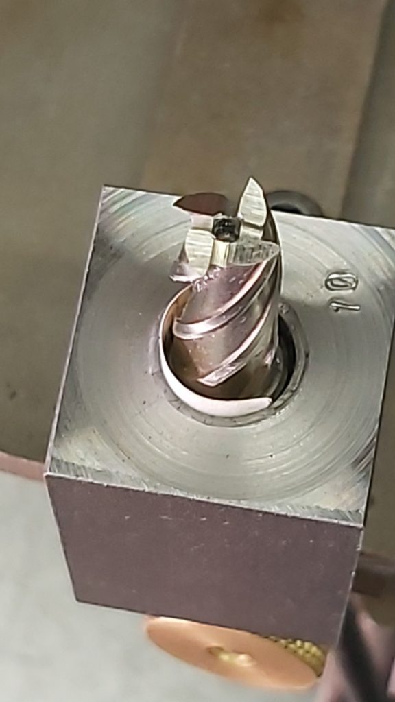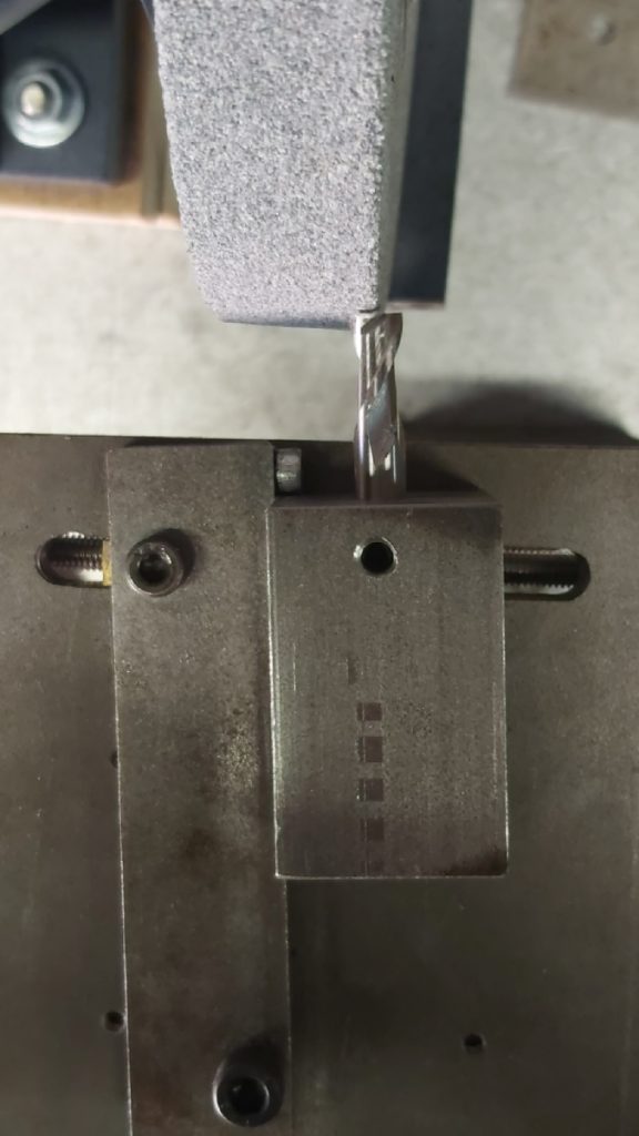 Set up for first use. I have set the 6mm two flute cutter in the block. It is set up that the cutting edge is parallel with the table floor, so that I can rotate the block 180 degrees so that both flutes are grounded exactly the same.