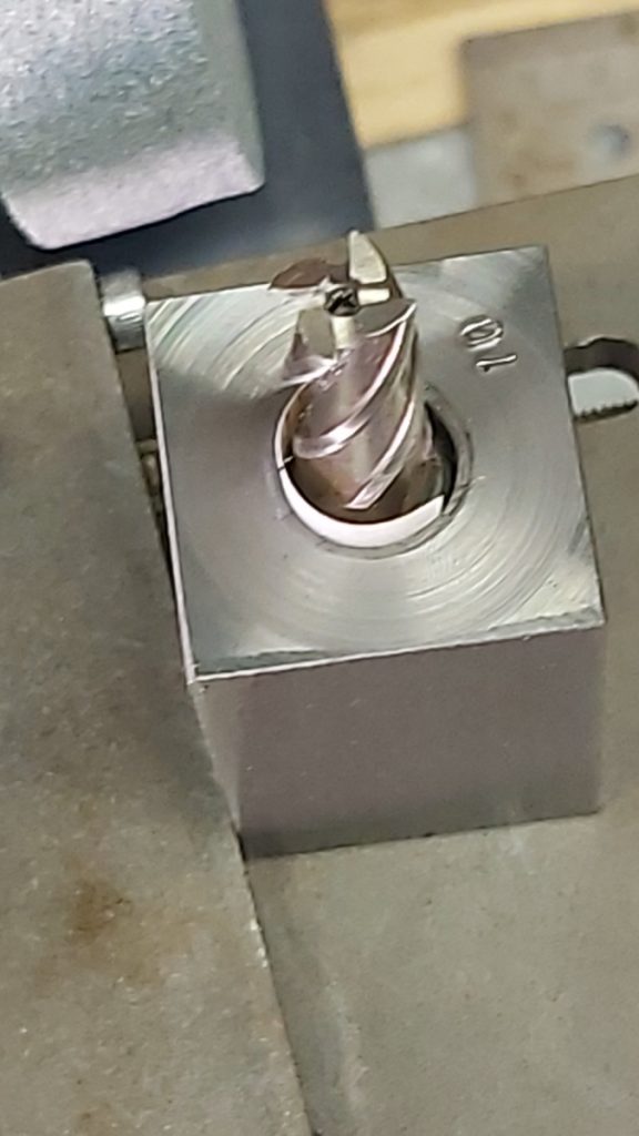 The 10 mm four flute cutter is blunt. You can see the four cutting edges are round. Due to the COVID-19 Lockdown period I do not have access to shops and therefore I could not buy reamers. I had to use an ordinary drill bit to drill the blocks. To compensate, I shimmed the cutter with paper.